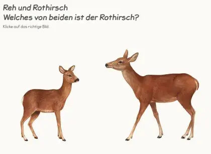 In diesem Quiz (11 Fragen) geht es darum, heimische Tiere, die oft verwechselt werden, zu unterscheiden. Kinder lernen den Unterschied, u.a. zwischen Reh und Rothirsch, Hase und Kaninchen, Amsel und Star, Mäusebussard und Habicht kennen. Nach jeder Antwort erklären ausführliche Texte den Unterschied zwischen den Arten. Diese müssen aber nicht gelesen werden, um das Quiz zu spielen.